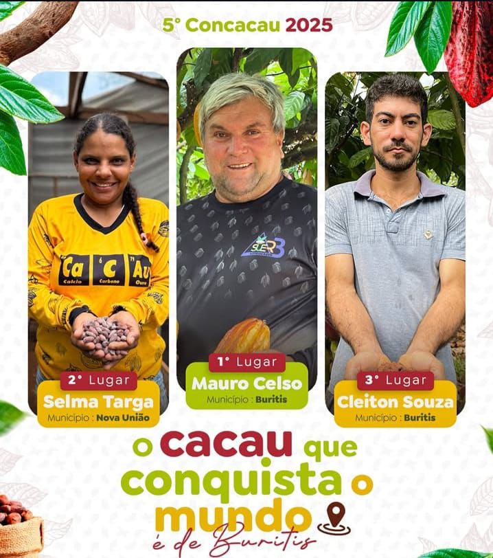 O município de Buritis voltou a brilhar no cenário estadual ao garantir o 1º lugar no 5º Concacau 2025, um dos principais concursos de qualidade de cacau da região. O produtor Mauro Celso, representante de Buritis, ficou com a melhor colocação do evento, consolidando o município como referência na produção de cacau de excelência.