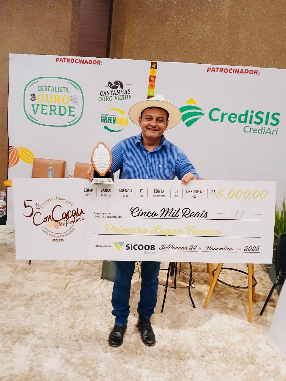 O concurso também reconheceu outros talentos da região. O 3º lugar foi conquistado por Cleiton Souza, também de Buritis, reforçando o protagonismo local na cadeia cacaueira. O segundo lugar ficou com Selma Targa, do município de Nova União, que completou o pódio com um produto de alto padrão.