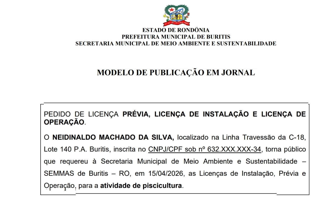 Licença Piscicultura Produtor em Buritis solicita à SEMMAS licenças prévia, de instalação e operação para atividade de piscicultura em propriedade rural. Buritis agora 20/04/2026 09h17 • Atualizado há 2 horas Compartilhar: Screenshot_20260420_091602_Edge.jpg 283.23 KB