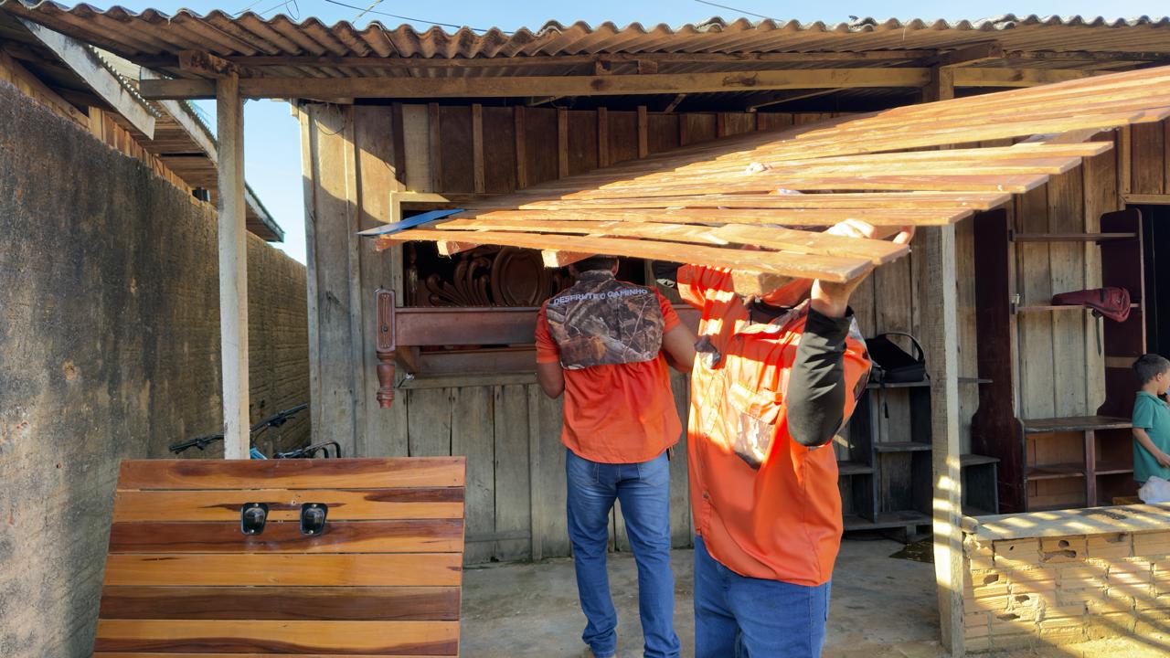 A ação teve como primeiro passo o desmonte da pequena residência, que já apresentava risco de desabamento. Em seguida, os voluntários realizaram a mudança da família para um local provisório, garantindo mais segurança neste momento delicado.