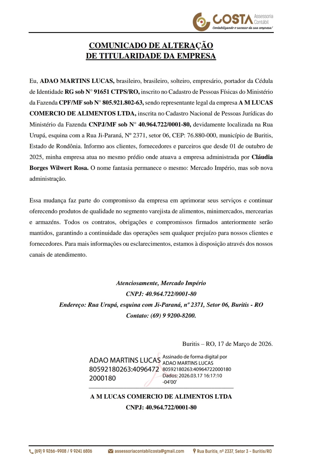 Nova Administração Empresa A M Lucas assume Mercado Império em Buritis, mantendo nome fantasia e garantindo continuidade dos serviços a clientes e fornecedores. Buritis agora 10/04/2026 16h28 • Atualizado há 1 dia Compartilhar: Screenshot_20260410_162158_Edge.jpg 689.68 KB
