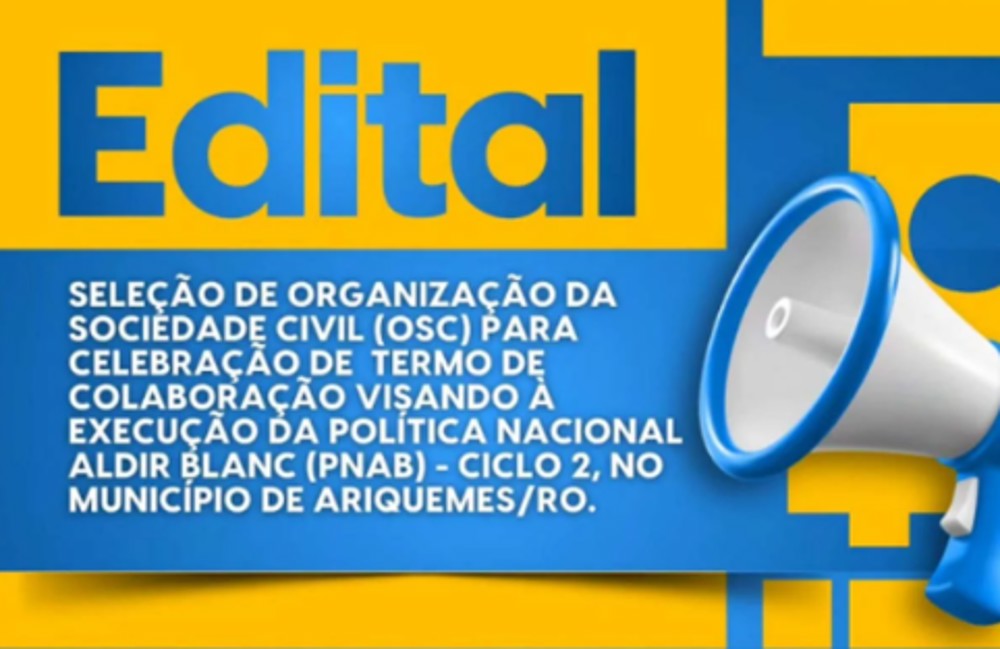 Atenção, organizações da sociedade civil!. A Prefeitura de Ariquemes está com edital aberto para a seleção de Organização da Sociedade Civil (OSC) visando a celebração de Termo de Colaboração para execução da Política Nacional Aldir Blanc (PNAB) – Ciclo 2 no município.