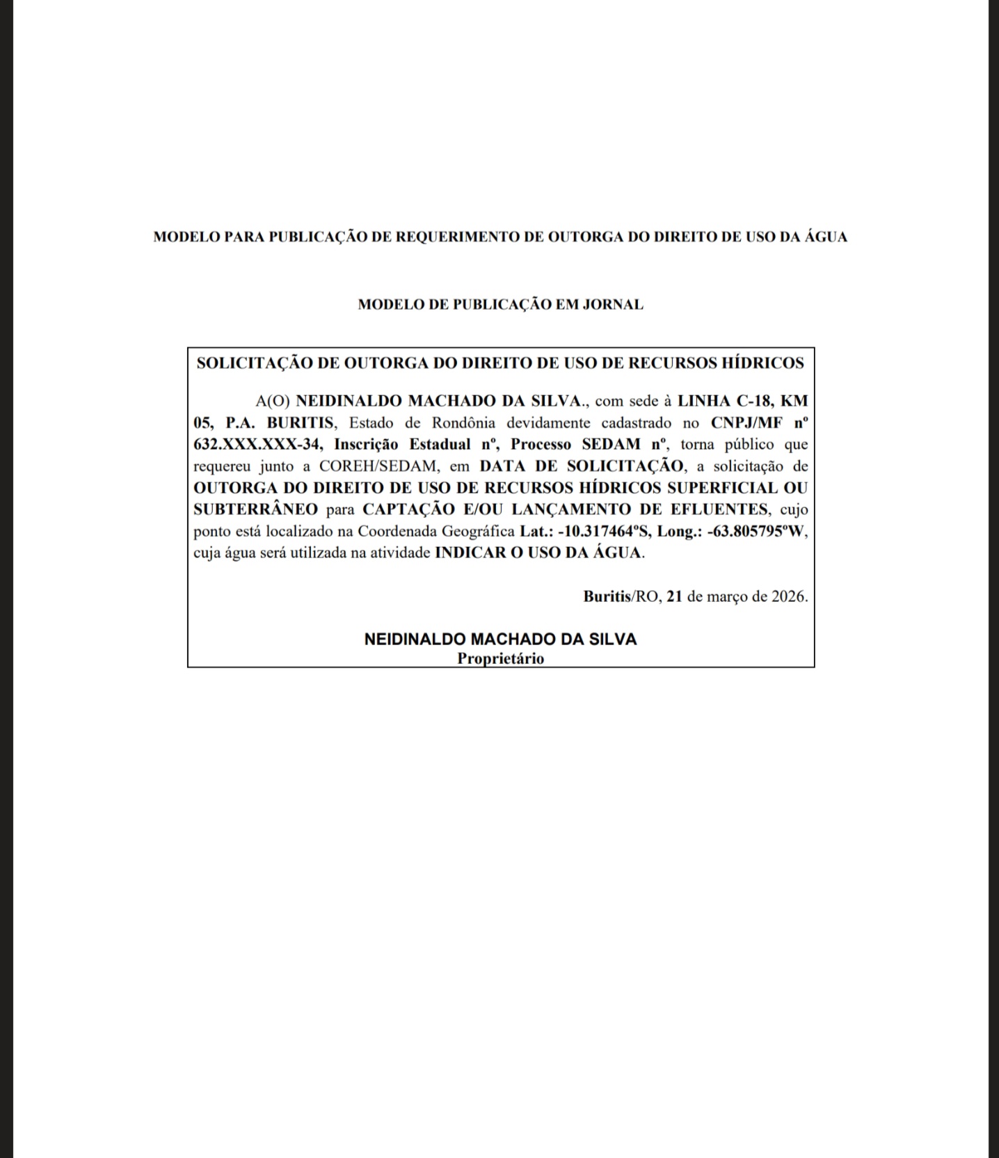 Proprietário em Buritis solicita junto à SEDAM outorga para uso de recursos hídricos, com captação ou lançamento de efluentes.